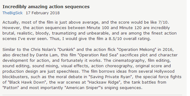 Similar to the Chris Nolan's Dunkirk, this film Operation Red Sea sacrifices plot and character development for action, and fortunately it works. The cinematography, film editing, sound editing, sound mixing, visual effects, action choreography, original score and production design are just speechless.