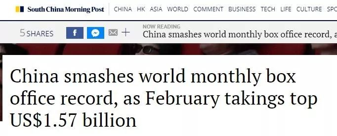 《南华早报》也发文报道称,中国票房实力碾压全球纪录,2月票房高达15.7亿美元。