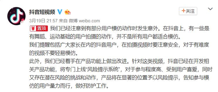 对近日“用户模仿动作被摔成重伤”一事,@抖音短视频 3月19日晚发布微博回应: