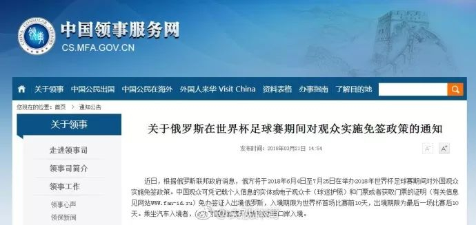 2018俄罗斯世界杯开幕在即,球迷们都在翘首期盼这个盛会的到来。日前,中国球迷收获了一个好消息,前往俄罗斯看世界杯的中国球迷可以免签入境!公告全文如下↓↓↓