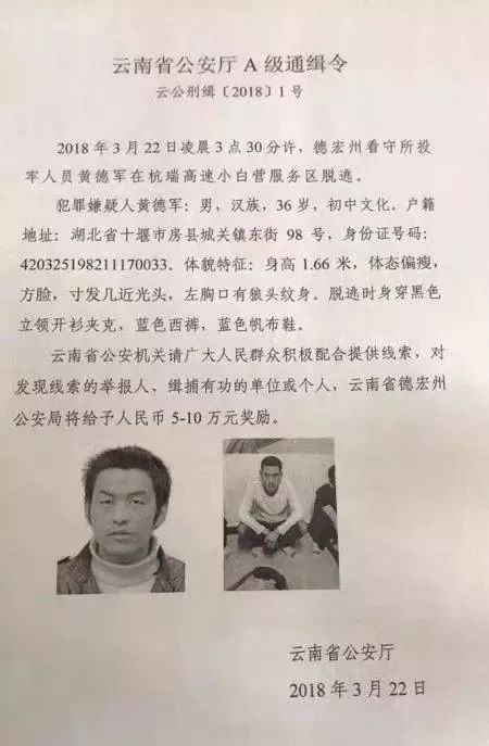 据云南省公安厅消息,3月23日9时46分许,在杭瑞高速小白营服务区脱逃的德宏州看守所运送昆明投狱的在押人员黄德军(男,汉族,36岁,初中文化,湖北房县人),经云南省公安厅调集大理、德宏、楚雄、保山等地公安机关警力连续奋战30小时,在大理州大理市下关镇关巍路口附近被大理警方成功抓获。