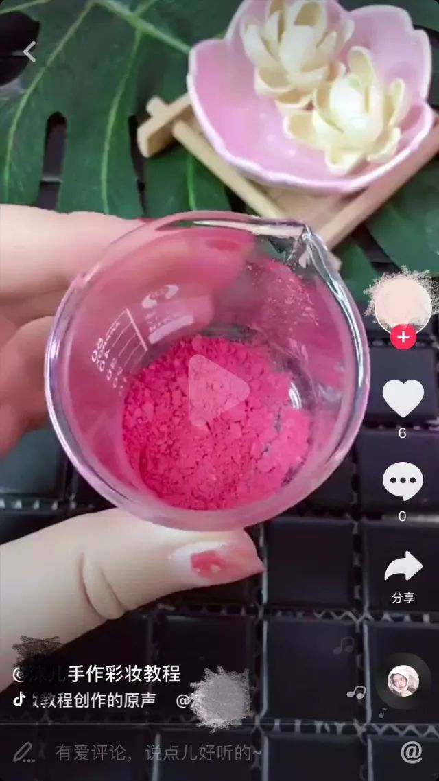 在抖音上,记者通过关键词找到了一个拥有4500多名粉丝的手作彩妆主播,在她的视频中有一个自制腮红的视频,她将一朵假花用酒精浸泡,然后将打碎的腮红加入酒精搅拌,并用刷子将加入酒精的腮红刷到假花上面,最后制作出了市面上售价高达六七百元的日本品牌拉杜丽的腮红。也就是开头您听到的那段腮红的制作过程。通过加其页面上的微信,在她朋友圈中,也发现了腮红等彩妆的售卖现象。