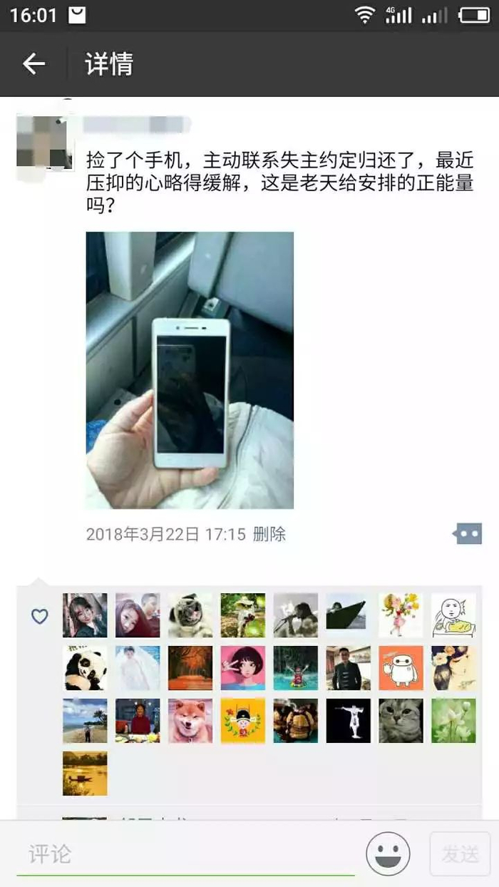 浏览于女士的朋友圈,记者发现,这并非是她第一次捡到东西,就在捡钱的前五天,她还捡到一部手机,3月22日,她在朋友圈里写到:捡了个手机,主动联系失主还了,最近压抑的心略得缓解,这是老天给安排的正能量吗?
