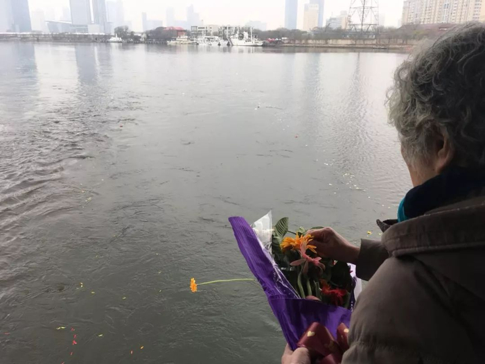 在司仪肃穆的悼词中,船舱的一角,一位老人白发苍苍,他将两个黄色的骨灰袋紧紧地抱在胸前,沉默不语。他叫赵志刚,和家人一起送别自己已逝的父母。他说,父亲是一名军人,生前曾嘱咐儿女,周恩来总理的骨灰就有一部分洒在天津的入海口,他要跟随周总理的步伐。在父母过世十年后的今天,自己已到迟暮之年,特来兑现曾经的承诺。