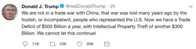 4月4日,特朗普在推特上称:“我们没和中国打贸易战,贸易战很多年前就被一帮自称代表美国的愚蠢无能的人给弄输了,现在我们每年有5000亿美元的贸易赤字和3000亿美元的知识产权被窃损失,我只是想要把之前的损失要回来。”