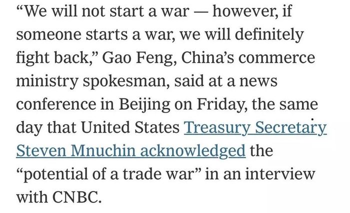 同时,在报道中,《纽约时报》再次引用了商务部新闻发言人高峰上新闻发布会上的话,“我们没有挑起贸易战。然而,如果有人打响贸易战,中方必定予以坚决回击。”