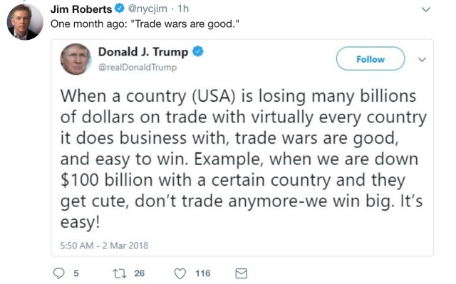 有网友拿出了特朗普一个月前发的推特,表示一个月前你是这样说的:“当一个国家(美国)几乎和每个有贸易往来的国家之间都有数十亿损失时,贸易战是件能轻易取胜的好事。”