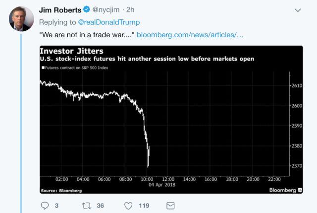 4月1日,中国宣布对美产品加征关税之后,道指周一又大跌了2%,又是一个8000亿美元没了。这下特朗普坐不住了,自己发推特:我们没有与中国进行贸易战!白宫官员也出面紧急喊话:股市乖孩子,别怕,中美两国的关税提议只是第一步,关税可能永远不会出现。