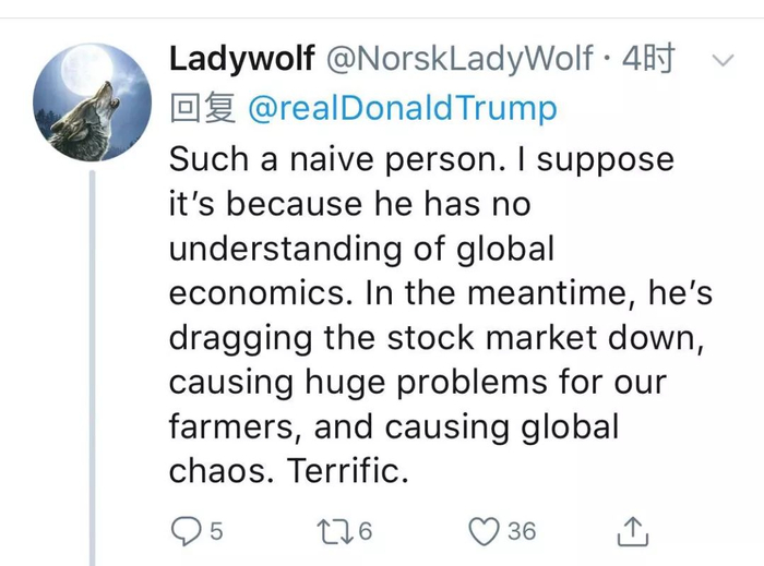 网友Ladywolf:简直是太天真。我认为他根本不懂什么是全球经济。与此同时,他拖垮美国股市,给农民带来巨大问题,还引起世界动荡。太可怕了!