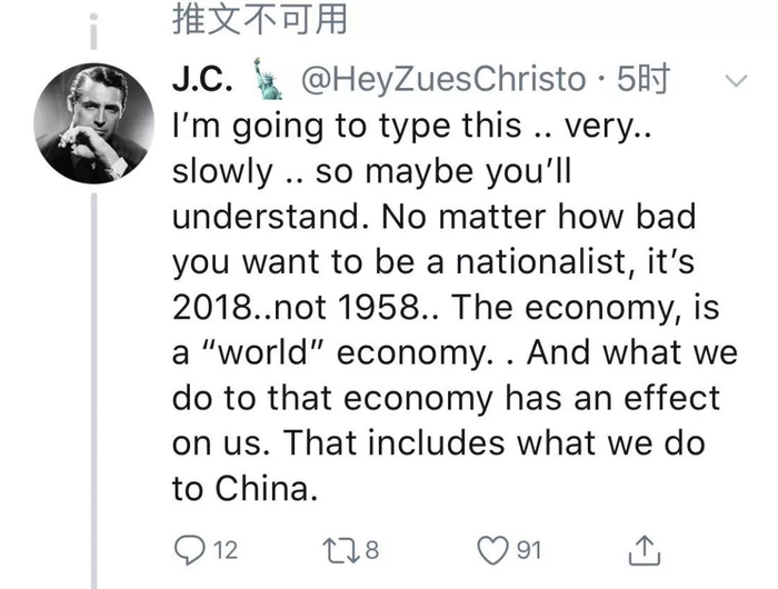 网友J.C.:我慢慢输入,非常慢,所以,也许你能看懂。(讽刺特朗普什么都不懂。)不管你想成为民族主义者这事儿有多不靠谱,现在是2018年不是1958年。现在的经济,是一个“世界”的经济。伤敌一千,自损八百,包括我们对中国所做的。