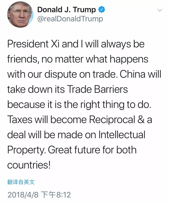 特朗普总统北京时间8日晚上在最新发出的推特中表示:“习近平主席和我将永远是朋友,无论我们的贸易争端如何。中国将取消贸易壁垒,因为这是正确的做法。税收将会变成互惠的,中美将会在知识产权上达成协议。两国都会有美好未来!”