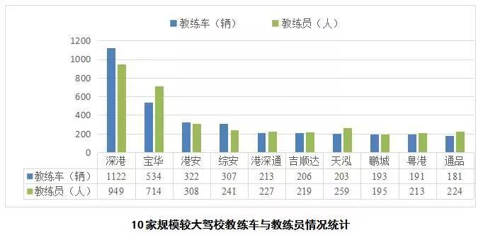 教练车及教练员规模较大的10家驾校分别为:深港、宝华、港安、综安、港深通、吉顺达、天泓、鹏城、粤港、通品。