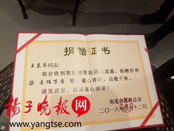 “这是老曹生前的愿望,也是他的一点小小的心意。他不图名不图利,只是为了回报家乡。”4月12日,在“雪域之光·曹旭慈善助学基金”捐赠仪式上,曹旭妻子王慕乔老人说。随后,她捧着放有现金支票和银行卡的托盘,郑重交到南通市慈善总会会长王德忠手中。