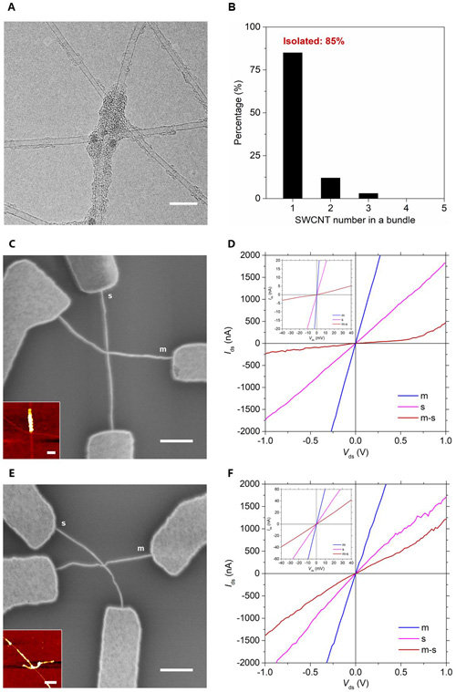 图1. 单根分散、具有碳焊结构的SWCNT网络。(A)典型TEM照片;(B)单根SWCNT的百分含量统计;(C-D)无碳焊结构的金属性-半导体性SWCNT的I-V传输特性;(E-F)有碳焊结构的金属性-半导体性SWCNT的I-V传输特性。