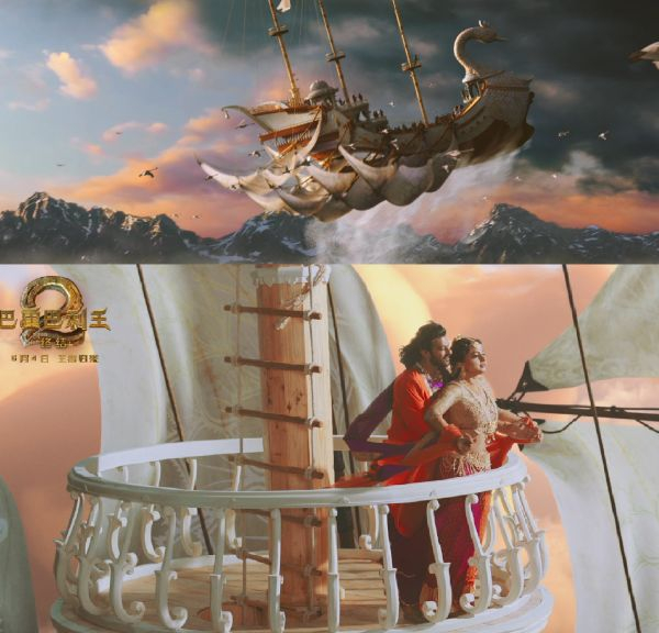 巴霍巴利王撩妹时的“男友力MAX”,让人想起周星驰《唐伯虎点秋香》的经典段落;男女主角组成双箭CP,退敌过程中配合默契,动作优美得仿佛在跳双人舞;乘船离开时,巴霍巴利王站在水里,一只手搭船舷一只手搭岸边自造“人肉桥”,供提婆犀那踩着登船;天鹅船飞到了空中,两人在云端载歌载舞,还重现了《泰坦尼克号》中的经典动作;提婆犀那被猥琐官员陷害,得知官员企图占自己妻子的便宜,巴霍巴利王二话不说一刀将其斩首,并称:“谁敢动她先问问我的刀”,妥妥的“宠妻狂魔”……