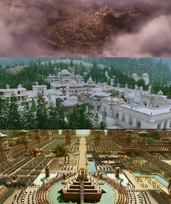 于是,你能在影片中看到色彩华丽特效逼真的布景,浓墨重彩欢快梦幻的歌舞,例如,冷兵器时代摩西施末底城恢宏华丽的建筑群——雄伟的巴霍巴利王宫金碧辉煌,陈设精致,就连王宫外的群山布景也特别大气。而提婆犀那公主所处的小国昆达拉,晶莹雪白的宫殿与被白雪覆盖的群山相互映衬,漂亮神圣;