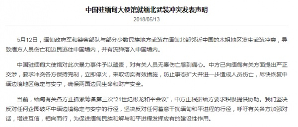 冲突发生后第二天(13日),作为被祸及的一方,中国驻缅甸大使馆发表声明称,冲突“导致缅方人员伤亡和边民逃往中国境内,并有流弹落入中国境内”。