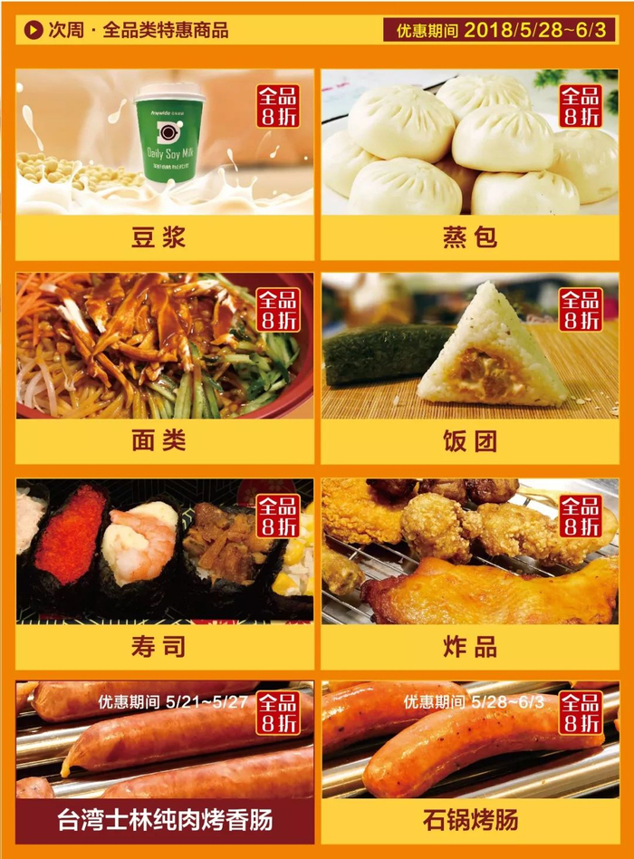 5月28日-6月3日会有包点、豆浆饭团、寿司、炸品、石锅烤肠全品八折优惠闻到了吗?会有的味道~*点击可放大查看