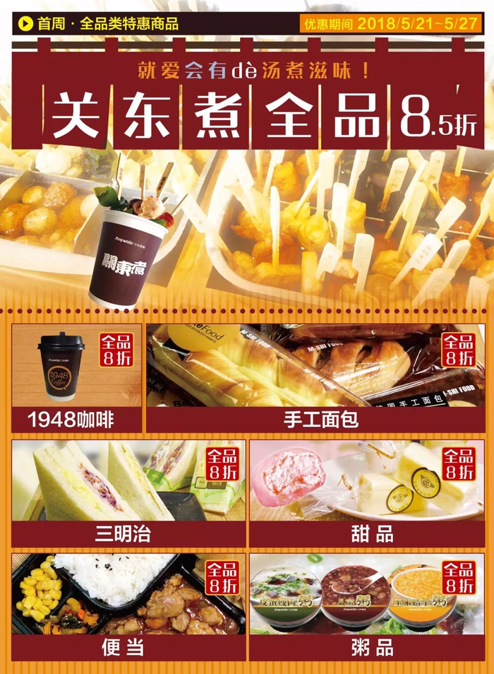 5月21日-5月27日会有关东煮全品8.5折1948咖啡、手工面包三明治、甜品、便当、粥品全部八折特惠*点击可放大查看