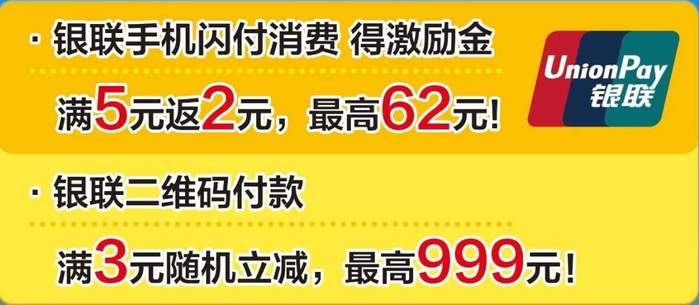 活动细则: 到店购物,使用银联云闪付支付,满5元返2元,最高62元!!!