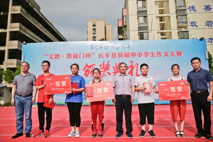 6月9日,合肥市长丰县黄冈学校的校园里,名家云集,盛况空前,来自全县60多所中小学的“才子才女”们汇聚于此,就“我心中,您最美”同题作文。“文德﹒凯旋门杯”长丰县首届中小学生作文大赛决赛在此鸣锣打响,从数万名参赛选手中脱颖而出的100余名夺锦之才向最后的荣誉发起挑战。经过专家级评委严苛评选,各类奖项一一敲定。当天下午,颁奖仪式在万众期待中拉开帷幕,获奖者名单在参赛选手、指导老师和学生家长的翘首期待中一一揭晓,获奖者依次走上舞台,接受来自全县教育、文联等领域名家的颁奖。