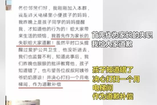 虽然平日口头提醒过爱护公共卫生,他没听进去,我们也监督不力,知道此事后,我们昨晚也狠狠地批评教育了他,孩子知道错了,也希望各位叔叔阿姨爷爷奶奶原谅,并决心打扫一个月电梯间,作为道歉补偿。