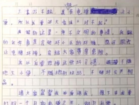 随后这位妈妈还在群里发了一张孩子亲笔写的检讨书:“我今天在电梯上小便,所以我要对大家说‘对不起’。我做的这是一件不文明的事情,我做的这件事破坏了小区的环境,也可能让电梯坏掉,给大家带来危险。我以后要改掉这些坏习惯,不随地大小便,不随地扔垃圾,不破坏公共物品。请大家监督我并原谅我。接下来我要打扫一个月的电梯卫生,作为补偿。”