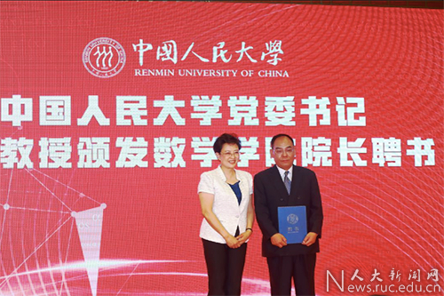 靳诺为国家杰出青年科学基金获得者郑志勇教授颁发聘书,郑志勇受聘为中国人民大学数学学院首任院长。