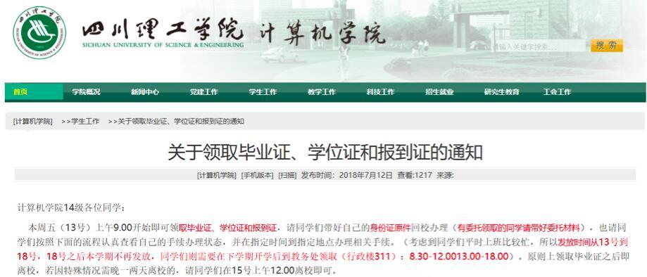 记者注意到,该校计算机学院官网于7月12日发布了《关于领取毕业证、学位证和报到证的通知》。《通知》称2014级毕业生可于7月13日上午9时起回校领取毕业证、学位证和报到证,办理截止时间为7月18日,18日之后本学期将不再发放,未及时办理的毕业生需在下学期开学后到教务处领取。
