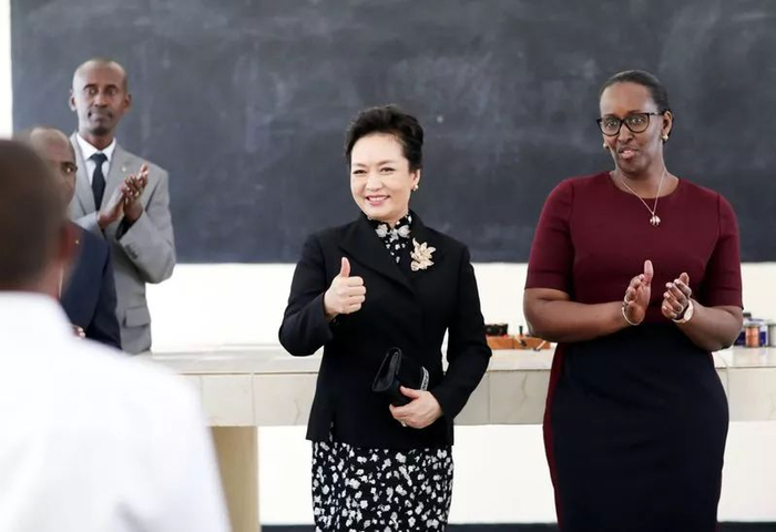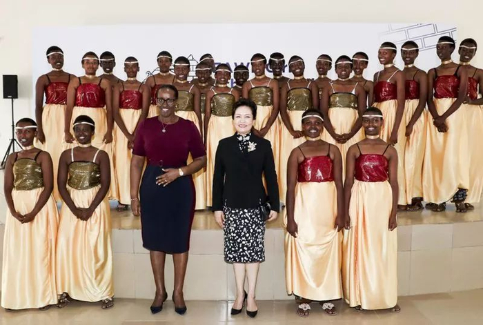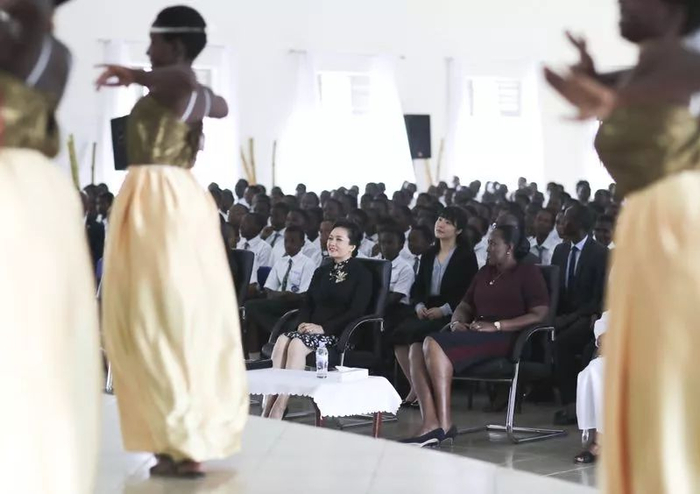 全校师生聚集在学校大礼堂,欢迎中国贵宾到来。当彭丽媛走进会场时,掌声雷动。同学们为彭丽媛呈上了一场精彩演出:学校校歌合唱高亢激昂、中国经典名曲《茉莉花》悠扬嘹亮、卢旺达民族舞蹈热情奔放。彭丽媛不断为学生的出色表演鼓掌。
