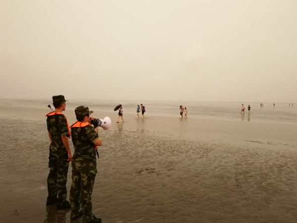 下午四五时海边天色已变,但风浪不大,仍有一些游客走到海塘大堤外的滩涂上玩耍,边防派出所的执勤人员拿着喇叭,劝说游客返回大堤,不要滞留在滩涂上。