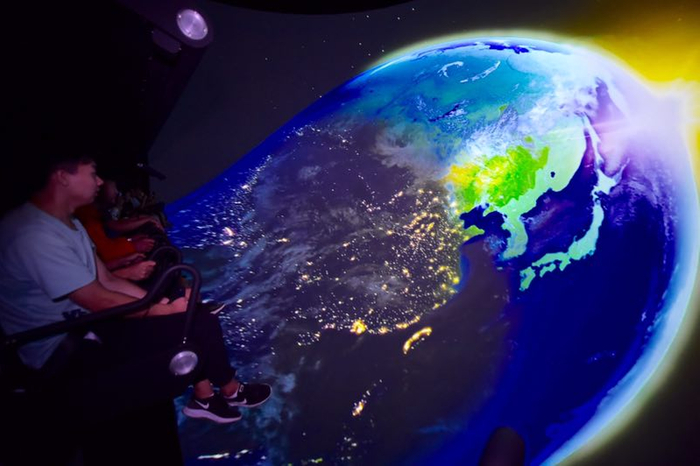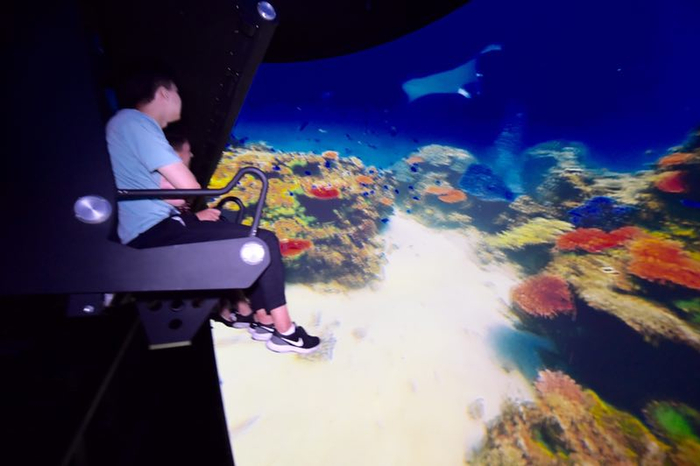 影院内安装了七组拥有独立六自由度的运动座椅平台,能够让每位观众实时感受到急速拉升、失重、俯冲等各种让人难以忘怀的超真实飞行感受。呈现在观众眼前的超震撼画面则是由4台4K激光投影机投放到直径近20米的球形巨幕上,再配上15.1声道音响,水雾、吹风、香雾等特效,可以将真实的、细腻的、独特的、高品质的感官体验带到极致。