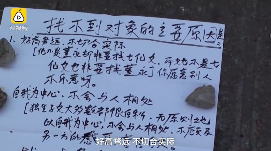 归根还是因为年轻的时候错过了谈恋爱的好时期,一位大爷甚至埋怨博士女儿“念书念傻了,书读出来了,时间耽误了,现在才想起找对象,晚了!”还有人属于情商偏低,不长心眼不当回事,有个家长说他的儿子在家玩电脑,让他年迈的父亲出去帮忙相亲,自己不愿意去抛头露面。