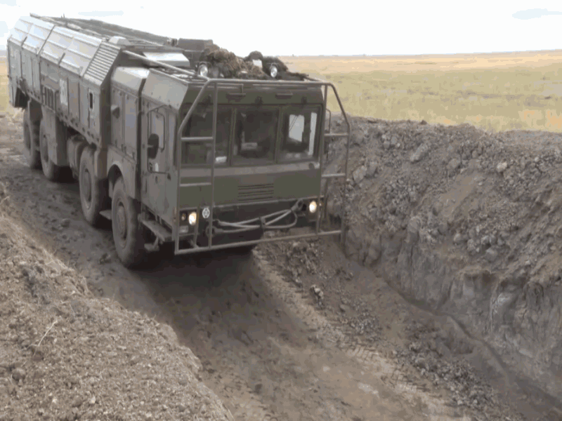 “伊斯坎德尔”-M导弹发射车在士兵引导下,驶入预设阵地(壕沟)连续镜头之一。