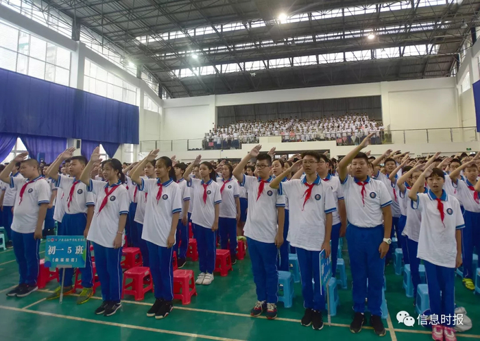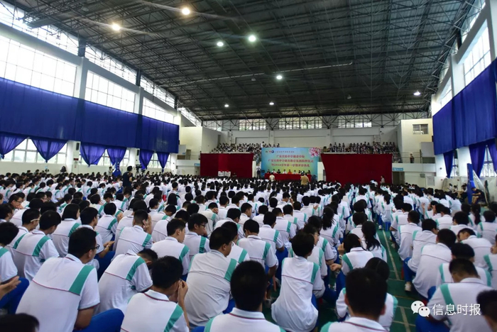 学校原定在操场进行开学典礼,但由于今早雨势较大,同学们移步至室内参加开学典礼。
