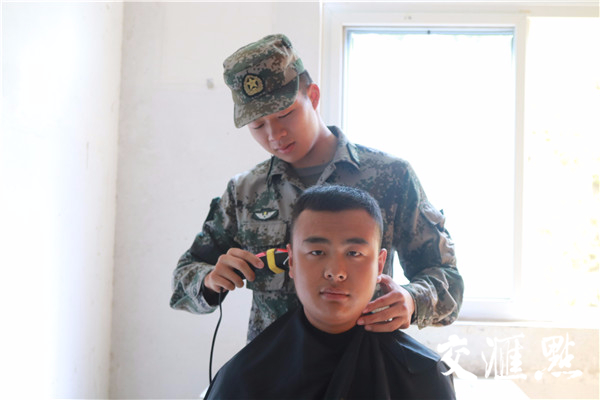 新兵班长孟凯文正在为新兵理发,他告诉记者自己入伍时班长也是这样给自己理发的,这叫做走进军营,从“头”开始。