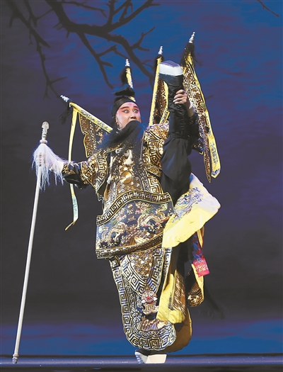 ■ 李政成:楔子就有意思。开场兵马涌动,背景音乐很嘈杂,突然一个导板,全场奔跑中的士兵全部定格,传统到了,史可法出场。我师傅裴艳玲说:看前面这些热闹,全是给传统垫的场。接着马夫牵着马,从我长枪上翻过。既是传统活,又是创新点。一开场就抓住观众眼球。