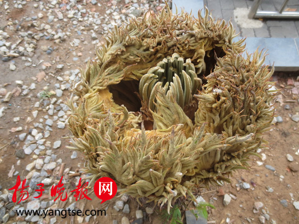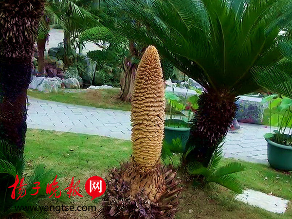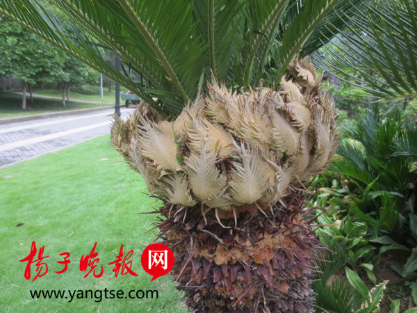 记者看到,在阅江楼古城边、绣球公园、小桃园、情侣园等处,绿化带的一棵棵铁树竟相绽放。据绿化人员陈师傅介绍,从铁树的花状来看,形如玉米花的铁树属雄性,而开出形如包菜的铁树花却为雌性。