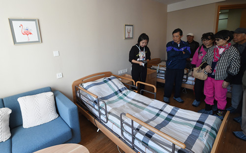 “朗诗常青藤”养老渠道经理孟庆薇也向参观的老人们,展示了一系列硬件设施上的细节:每个房间都配备了空调、热水器、衣橱等;卫生间干净整洁,有安全扶手;床是三段式设计,上半身不便的老人可以将上半部分的床进行上下调节,下半身水肿的老人可以调节床的下半部分,而身高较高的老人可以对床的整体进行调整。