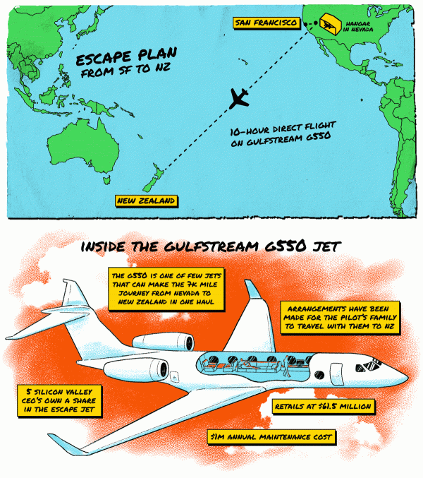 他打算飞往内华达州的一个着陆跑道。那里的一个机库里停放着一架喷气飞机,这架飞机的唯一目的是把他和4位与他共同拥有飞机的亿万富翁送到安全的地方。他们的目的地是新西兰——毛利人称之为“长白云之乡”。