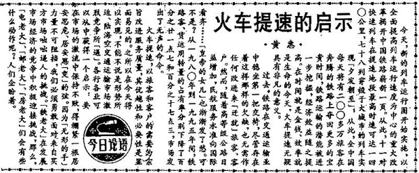 写这篇评论的是新民晚报记者黄惠,当时她到报社评论组一年不到,看到火车提速的新闻比较兴奋,就写了此稿,“发表在头版还蛮意外的,但也说明火车第一次大面积提速是一件大事,正如稿子里所写,‘以全面提高列车运行速度为中心的重大改革揭开中国铁路崭新一页’。”当时,全国范围内11对快速列车在提速地段最高时速可达140公里,78列穿梭于大城市的列车实现“夕发朝至”。文章说,上个世纪90年代,人们经常说“时间就是金钱、效率就是生命”,火车提速,也是形势所迫、陆海空交通运输市场激烈竞争所“逼”,简单地说,无论是服务,还是速度,当时的火车已经跟不上时代的车轮了。