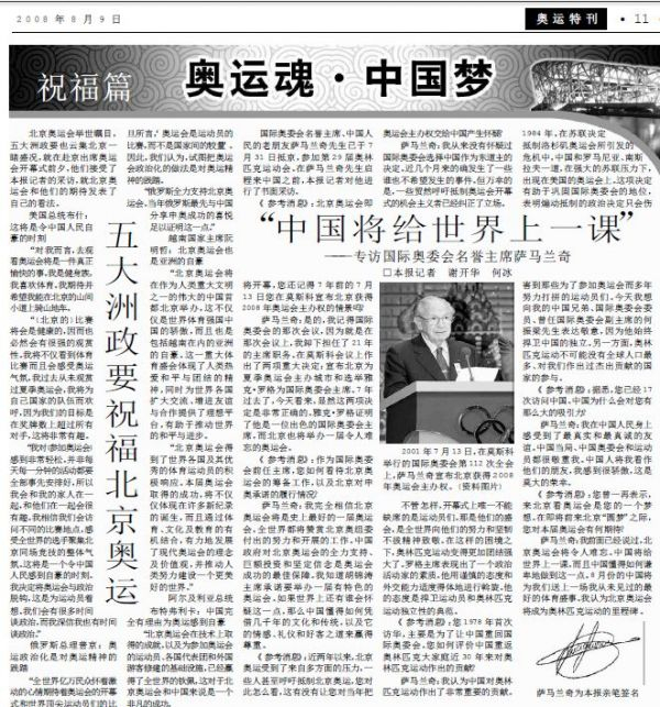 2008年8月9日《参考消息》,右下角还有萨马兰奇为本报的亲笔签名哦。