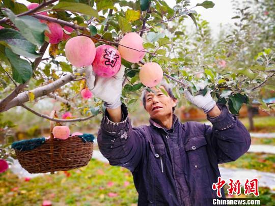 小苹果已经成为庆阳市庆城县的大产业,更成为农民脱贫致富的“金饭碗”。图为庆阳市庆城县赤城乡农户忙着采摘苹果。(资料图) 高展 摄