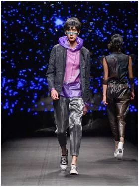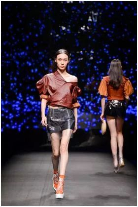 用PVC、塑料、树脂等新型人造材质面料,将香云纱与透明雨衣和运动感罩衫相结合,模仿太空科技感的时装廓形结构设计。