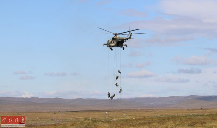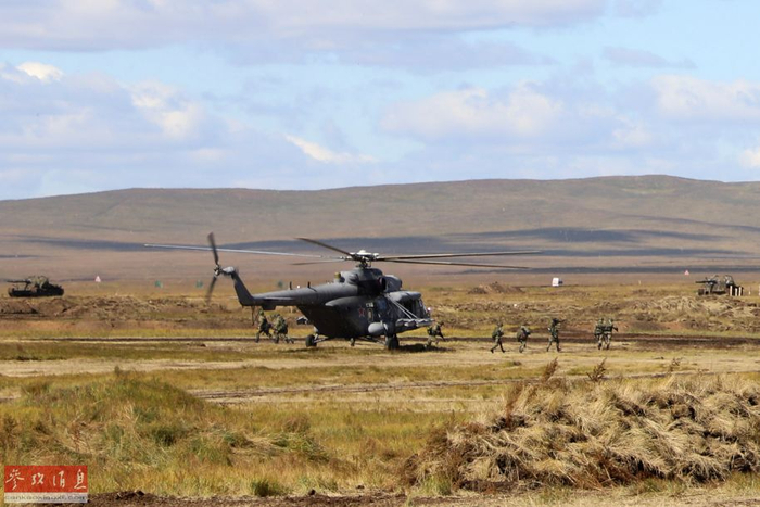 “东方-2018”战略演习联合战役实兵演练中,俄方米-8直升机搭载突击队进行机降。(新华社记者 樊永强摄)