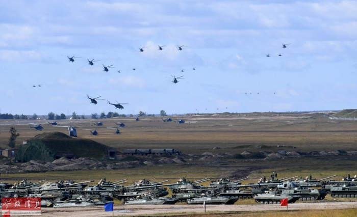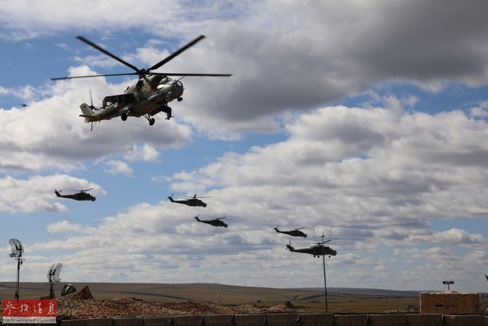 9月11日至13日,号称俄罗斯史上最大规模的“东方-2018”联合军演在俄罗斯楚戈尔草原举行。俄军参演兵力达到30万人,参演各型军机1000多架,地面参演坦克及装甲车辆达3.6万辆。首次受邀参演的中方部队参演兵力3200人,地面装甲车辆1000余辆,战机及直升机30架。图为“东方-2018”战略演习联合战役实兵演练开始后,俄方米-24武直机群进入演习地域,开始实施机动防御。(新华社记者 樊永强摄)