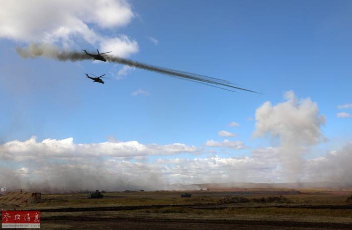 “东方-2018”战略演习联合战役实兵演练中,空中直升机编队和地面装甲车队进行陆空联合反击。(新华社记者 樊永强摄)