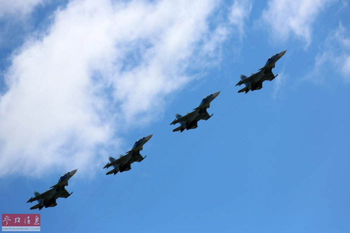 9月13日,在俄罗斯楚戈尔训练场,“东方-2018”战略演习实兵演练结束后举行沙场检阅。这是俄方苏-30SM战机编队飞过阅兵场。(新华社记者 李祥辉摄)