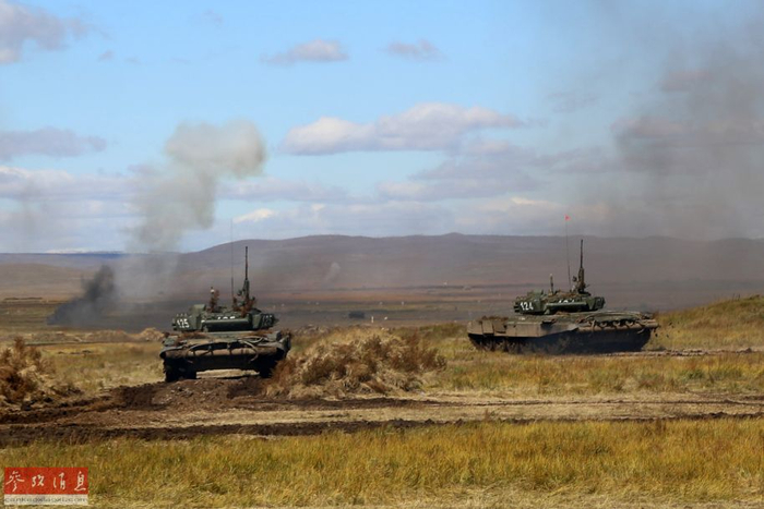“东方-2018”战略演习联合战役实兵演练中,俄方坦克分队进行反击作战。(新华社记者 樊永强摄)