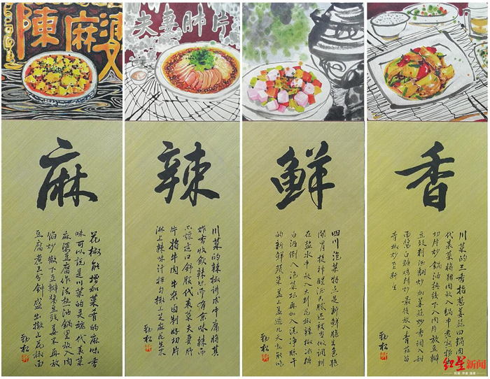 据画家郭劲松介绍,他经过一个月的创作,绘制了具有川菜典型风格的麻婆豆腐、夫妻肺片、四川泡菜、回锅肉,以麻辣鲜香体现四川美食的精髓,并配以书法文字讲解美食特点和简单的制作过程。